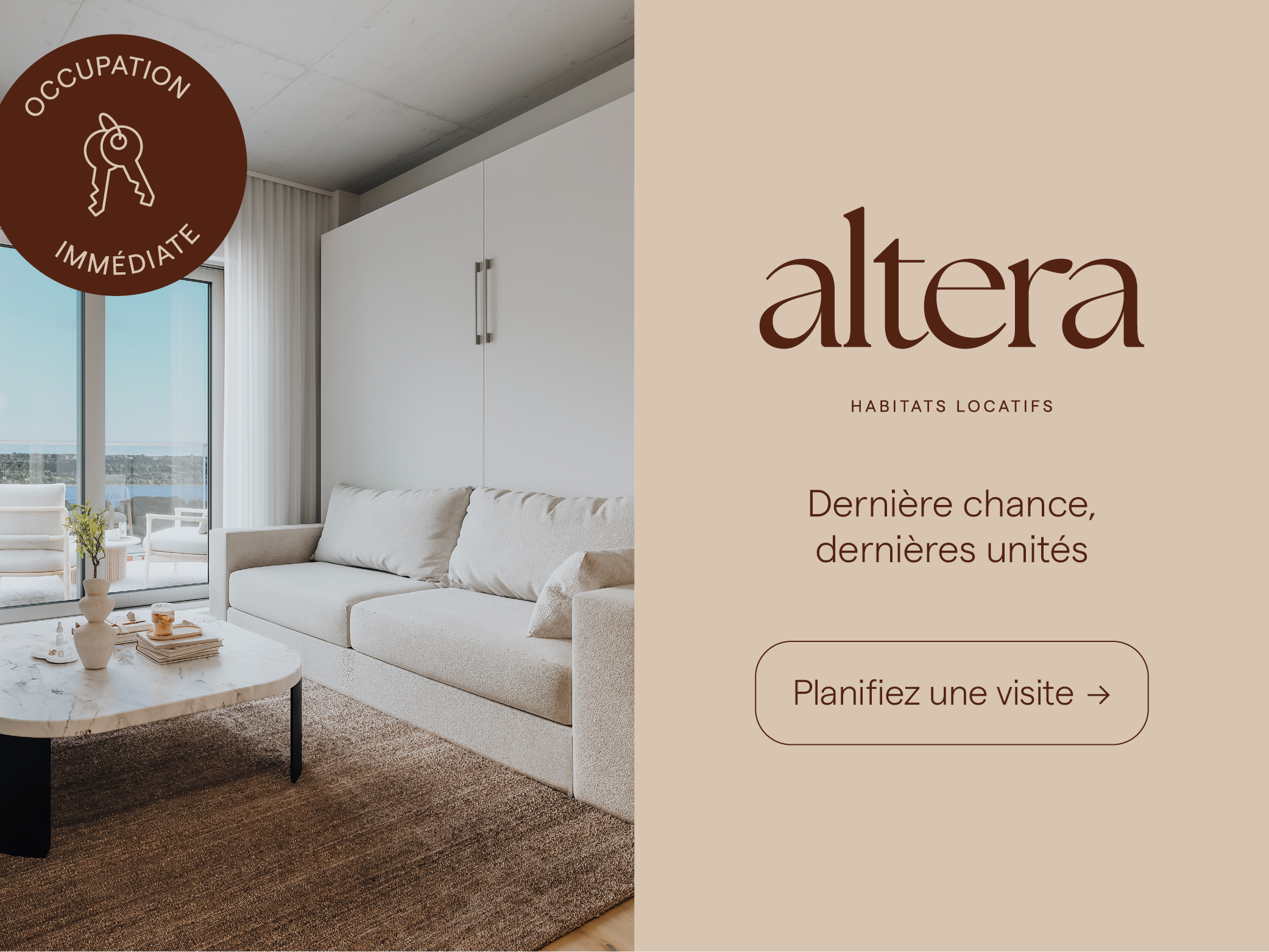 Panoramas époustouflants sur le fleuve, une panoplie d'activités sportives en plein air et un bien-être absolu.Découvrez Altera, la première phase locative du Quartier Richer, un ensemble résidentiel réinventé comprenant 109 unités locatives, allant du studio douillet aux somptueux appartements de deux chambres avec bureau. Chaque espace offre un cadre de vie exceptionnel, avec des finitions exquises et de généreuses fenêtres qui dévoilent des vues spectaculaires sur la forêt, les montagnes et le fleuve.