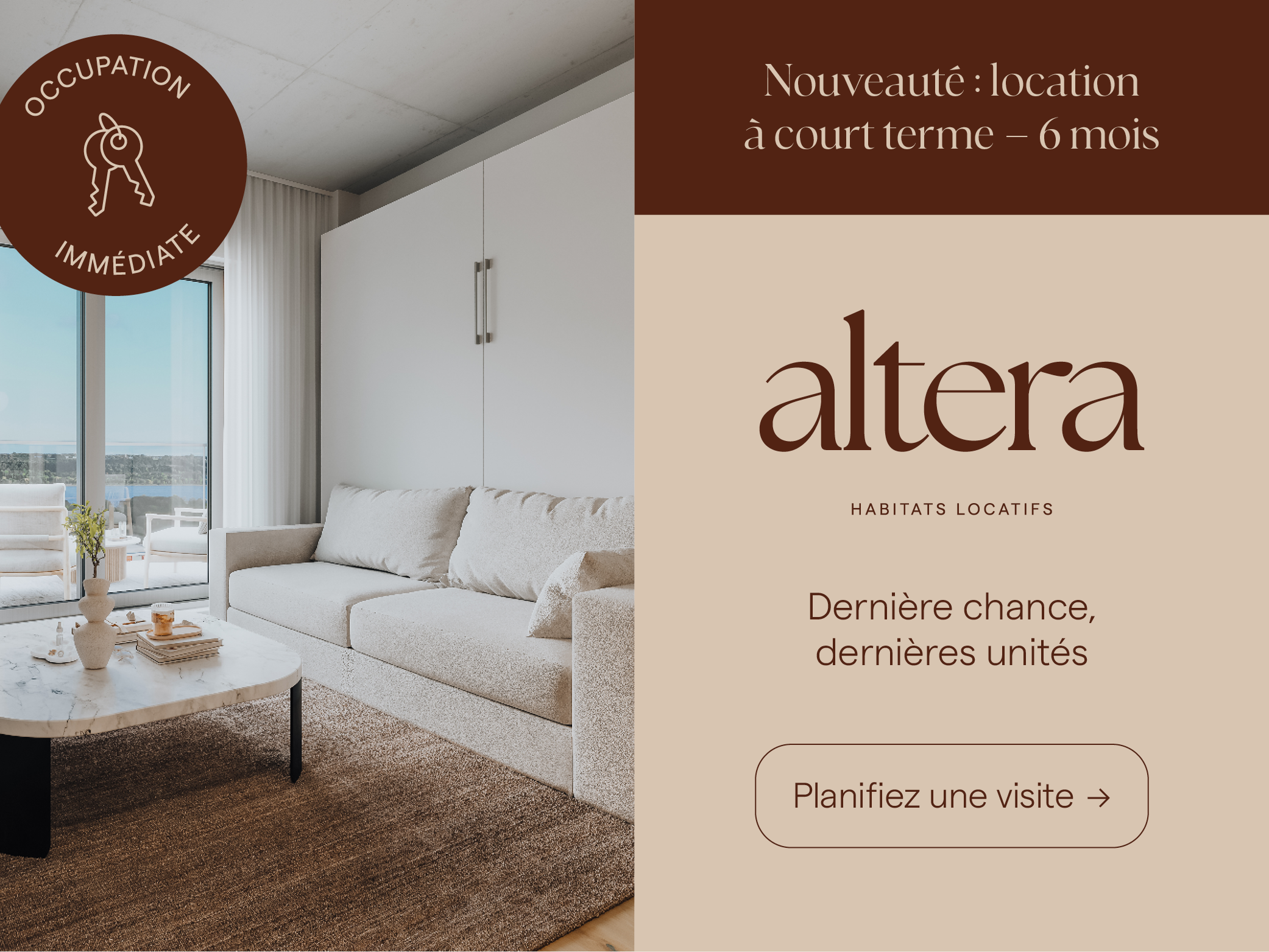 Panoramas époustouflants sur le fleuve, une panoplie d'activités sportives en plein air et un bien-être absolu.Découvrez Altera, la première phase locative du Quartier Richer, un ensemble résidentiel réinventé comprenant 109 unités locatives, allant du studio douillet aux somptueux appartements de deux chambres avec bureau. Chaque espace offre un cadre de vie exceptionnel, avec des finitions exquises et de généreuses fenêtres qui dévoilent des vues spectaculaires sur la forêt, les montagnes et le fleuve.